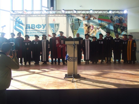 По традиции первыми на сцену поднялись члены Ученого совета, облаченные в университетские мантии. С поздравлением к коллегам обратился директор Юридической школы Владимир Курилов. Он отметил, что по качеству преподавания и научным достижениям школа стоит в одном ряду с лучшими учебными заведениями России. Юридическая школа ДВФУ – единственная на Дальнем Востоке и в Восточной Сибири, где проходят образовательные программы на всех уровнях юридического образования. Школа успешно сотрудничает с профильными вузами страны, развивает связи с международными организациями и юридическими вузами стран Азиатско-Тихоокеанского региона. На сегодняшний день подготовка современных юристов ведётся с использованием электронных ресурсов, а также дистанционных образовательных программ.