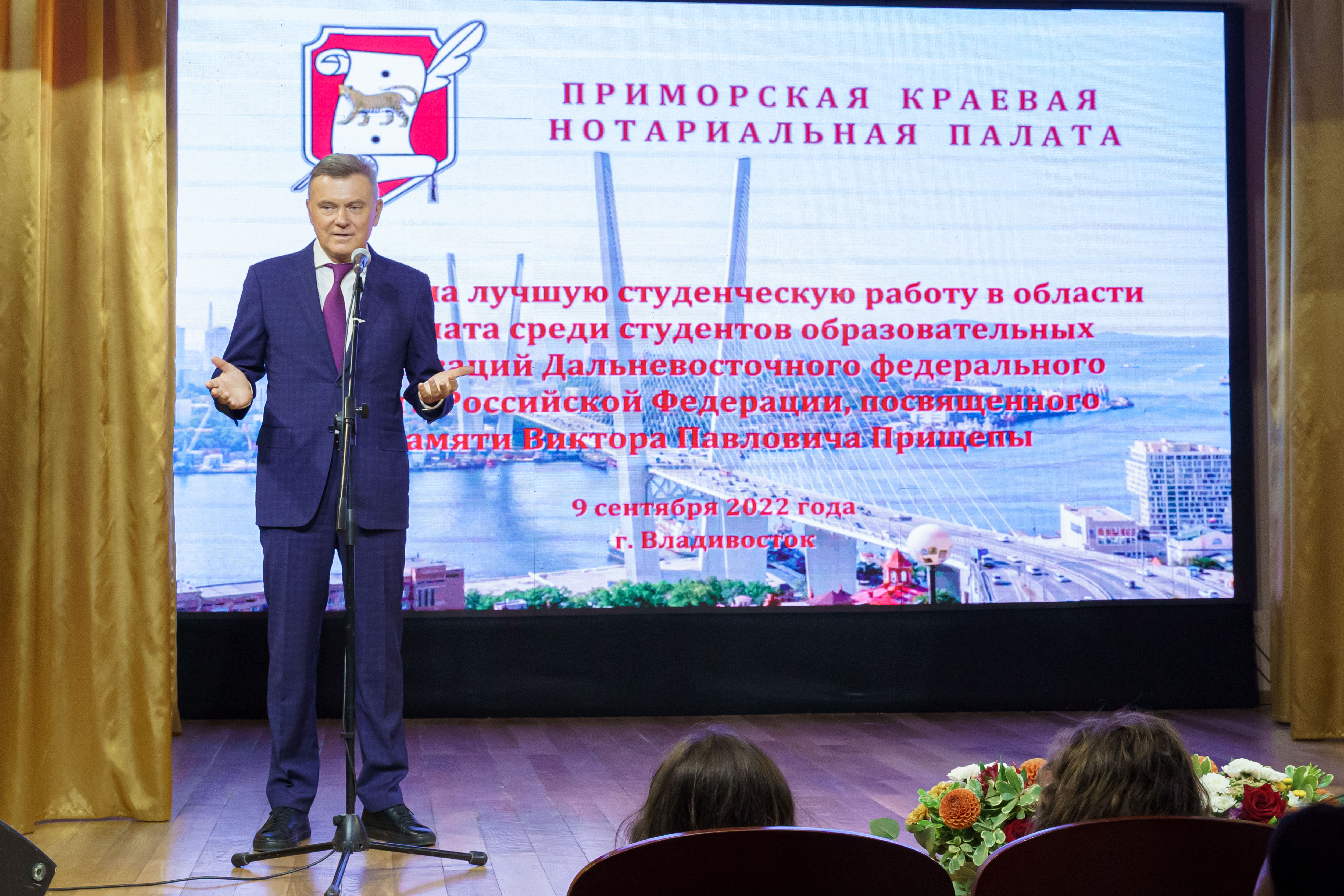 9 сентября на базе Приморской краевой нотариальной палаты состоялась церемония награждения победителей Конкурса на лучшую студенческую работу в области нотариата среди студентов вузов Дальнего Востока. В этом году награждение победителей прошло в дни празднования 220-летия Министерства юстиции Российской Федерации в стенах Приморской краевой филармонии. Конкурс был учрежден по инициативе Федеральной нотариальной палаты, Главного управления Минюста РФ по Приморскому краю и Приморской краевой нотариальной палаты и посвящен памяти заслуженного юриста РФ, президента Приморской краевой нотариальной палаты Виктора Павловича Прищепы.