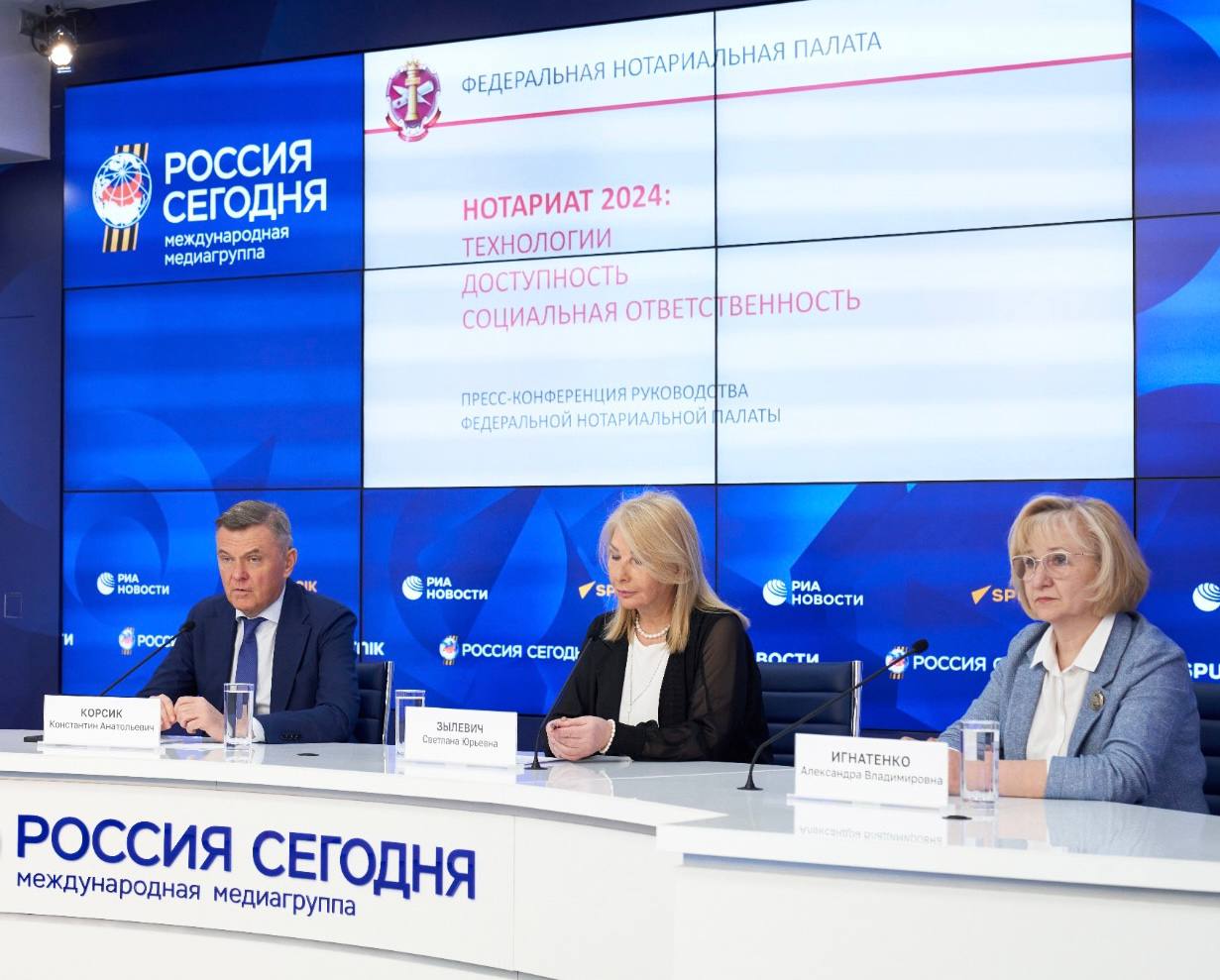 Важной темой пресс-конференции стало развитие цифрового нотариата, которому этим летом исполнится уже 10 лет. «Мы разработали и создали эту уникальную систему целиком и полностью по нашей инициативе и на средства нотариата, и все последующее развитие цифровых технологий в нотариате и во многом — в целом в правовой сфере, основано на ней», — отметил Константин Корсик.