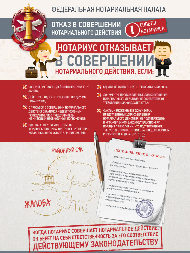 Если вы обратились к нотариусу, а он отказал в совершении нотариального действия, то, по вашей просьбе, он должен изложить причины отказа в письменной форме и разъяснить вам порядок его обжалования. Не позднее чем в десятидневный срок со дня обращения за совершением нотариального действия нотариус должен вынести постановление об отказе в совершении нотариального действия.